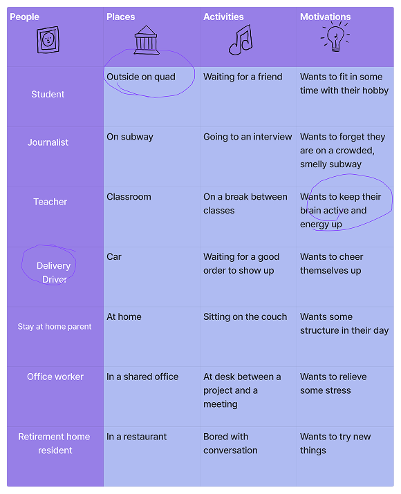 Next, a grid of likely people, contexts, and needs was created. Random elements were chosen from each category